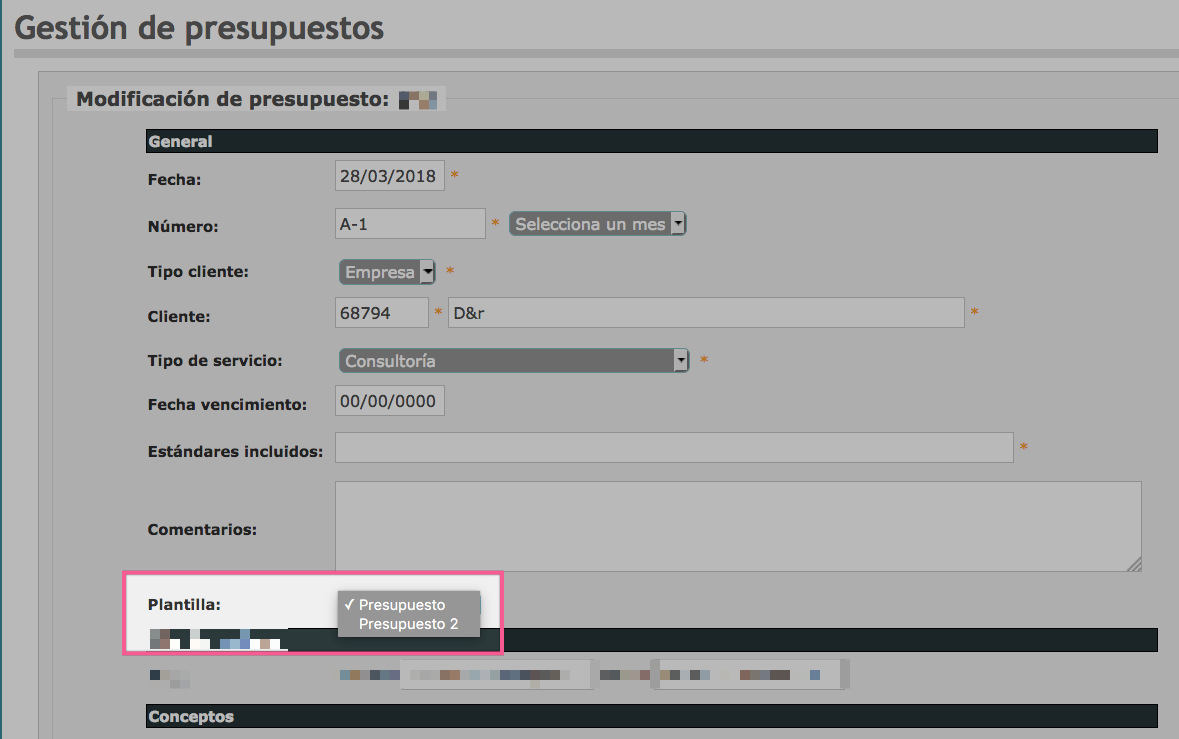A la hora de generar el presupuesto, en el formulario encontrarás una opción que te permite seleccionar la versión de la plantilla que te interesa utilizar: