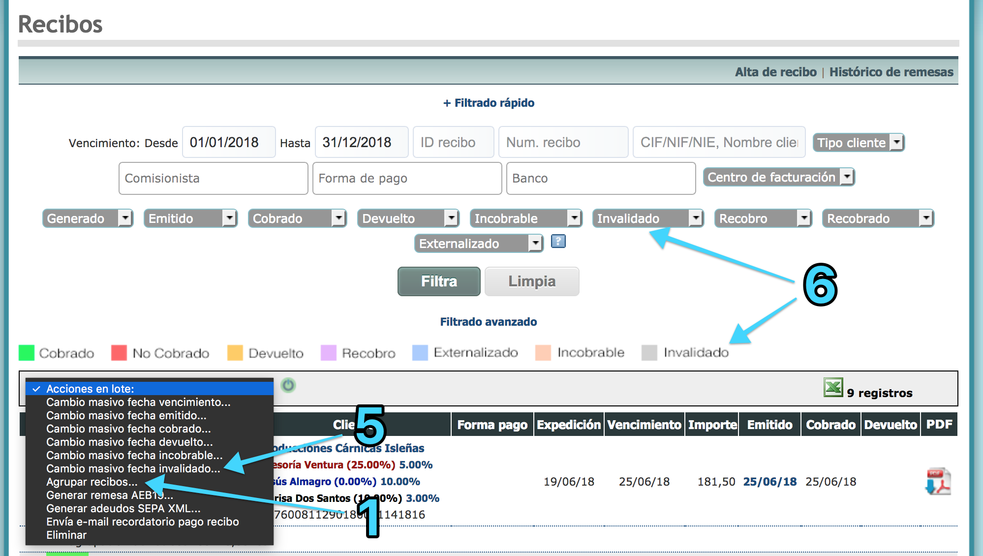De forma automática, al crear un recibo agrupado, en los recibos originales se establece en el campo Invalidado la fecha del día en que se lleva a cabo la acción.