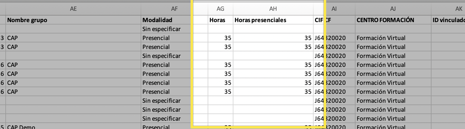 Ya está implementada. Hemos incorporado la columna Horas presenciales en los 3 excels que se generan desde facturas