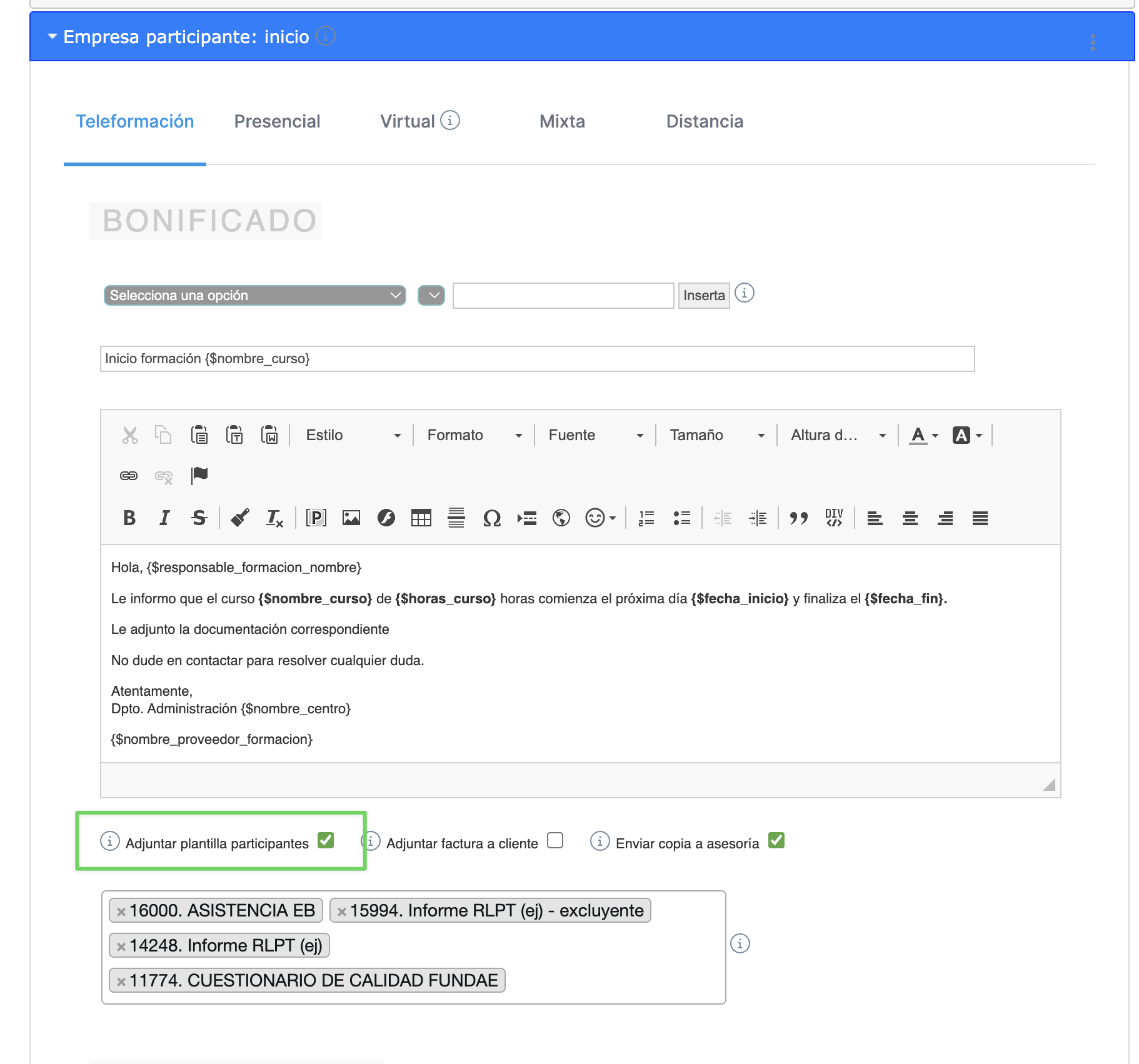 necesitamos que se pueda seleccionar adjuntar la "plantilla participantes Fundae" en la Comunicación Empresa participante: inicio