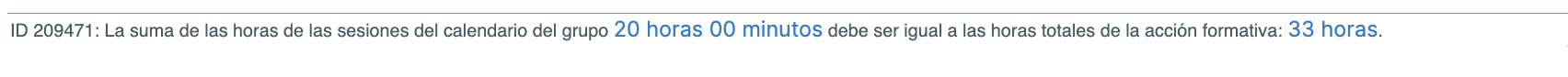 Mensaje: La suma de las horas de las sesiones del calendario del grupo XXhoras XXminutos debe ser igual a las horas totales de la acción formativa: XXhoras.