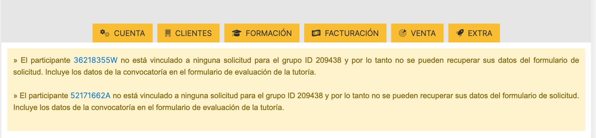 El participante X no está vinculado a ninguna solicitud para el grupo ID y por lo tanto no se pueden recuperar sus datos del formulario de solicitud. Incluye los datos de la convocatoría en el formulario de evaluación de la tutoría.