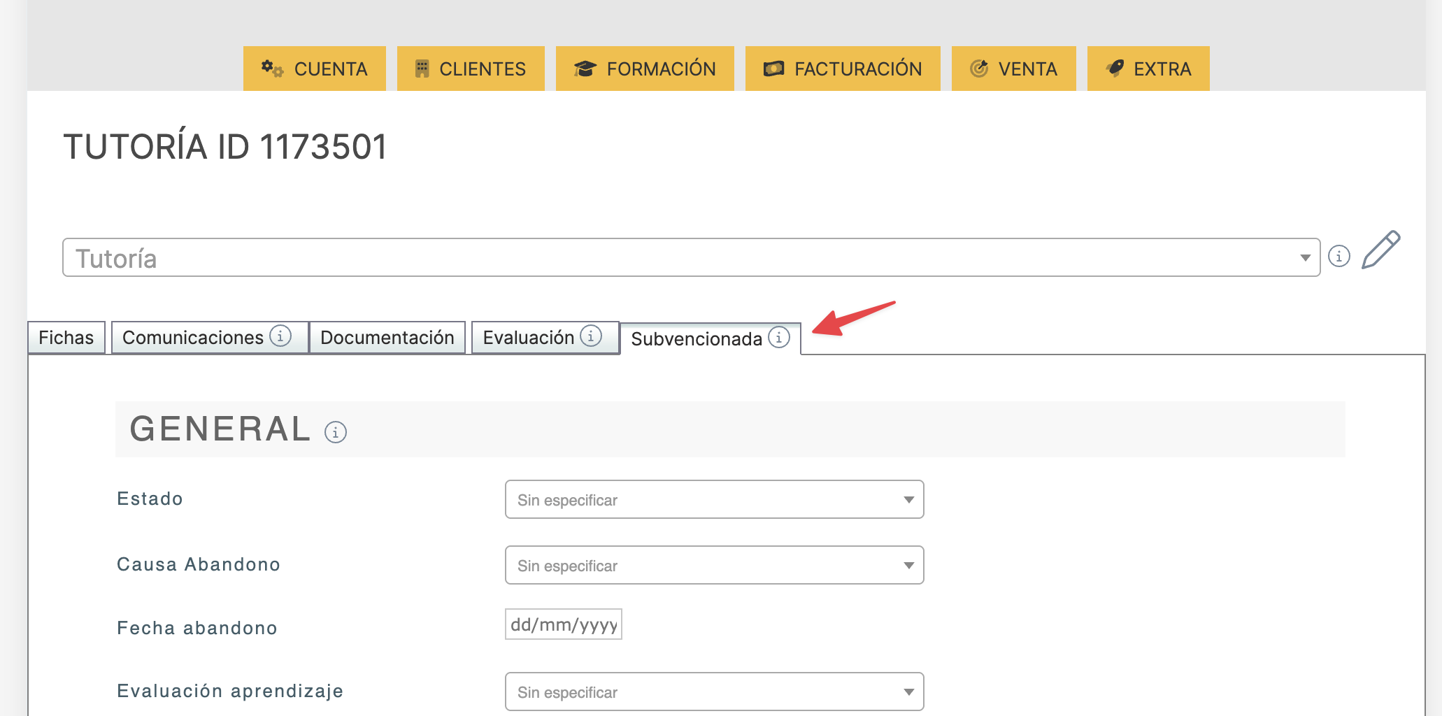 2. En la ficha de su tutoría, en la pestaña o "evaluación subvencionada"